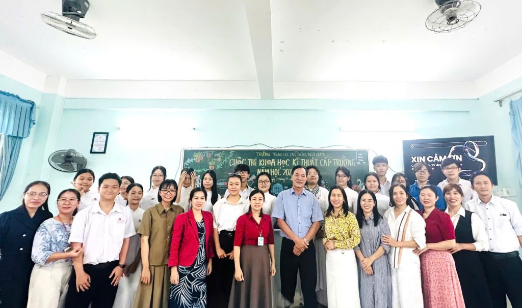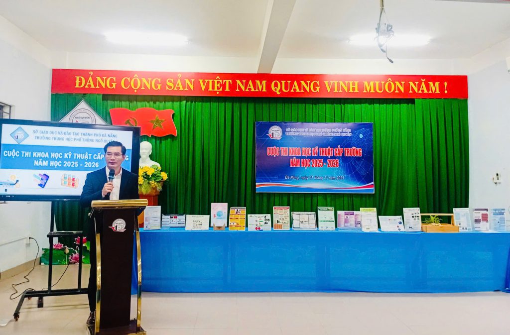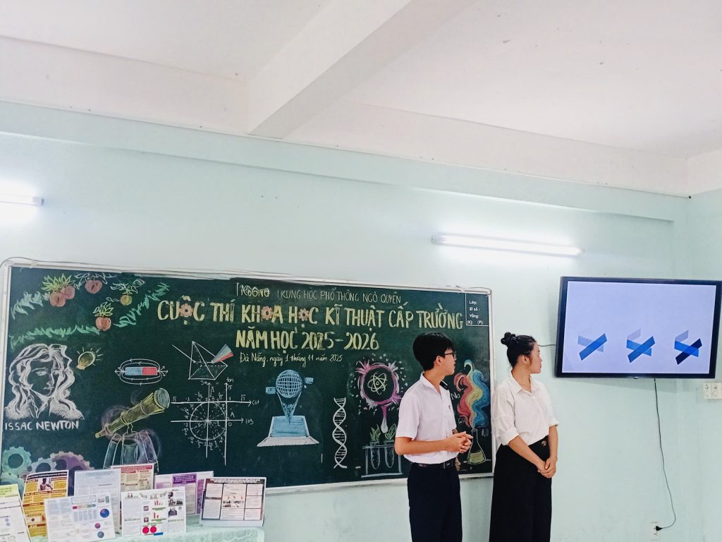 Triển khai thực hiện Nghị quyết số 57-NQ/TW ngày 22/12/2024 của Bộ Chính trị về đột phá phát triển khoa học, công nghệ, đổi mới sáng tạo và chuyển đổi số quốc gia; thực hiện Kế hoạch số 102/KH-THPTNQ ngày 29/9/2025 của trường THPT Ngô Quyền về việc tổ chức và tham gia Cuộc thi khoa học kỹ thuật các cấp năm học 2025-2026, nhằm khuyến khích học sinh nghiên cứu, vận dụng kiến thức để giải quyết các vấn đề của thực tiễn cuộc sống; gắn hoạt động nghiên cứu khoa học của học sinh với việc đổi mới phương pháp, hình thức tổ chức dạy học, đánh giá kết quả học tập của học sinh, góp phần phát triển phẩm chất, năng lực học sinh, sáng ngày 01/11/2025 trường THPT Ngô Quyền tổ chức Chung kết Cuộc thi khoa học kỹ thuật cấp trường năm học 2025-2026.
